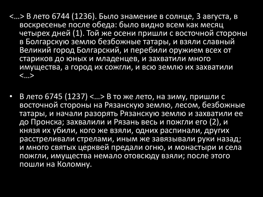 <…> В лето 6744 (1236). Было знамение в солнце, 3 августа, ввоскресенье после обеда: было видно всем как месяц