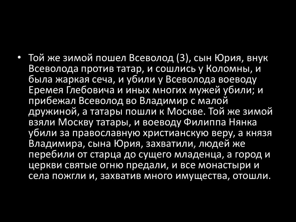• Той же зимой пошел Всеволод (3), сын Юрия, внукВсеволода против татар, и сошлись у Коломны, и