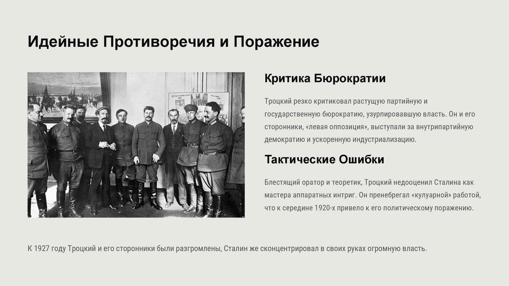 К 1927 году Троцкий и его сторонники были разгромлены, Сталин же сконцентрировал в своих руках огромную власть.