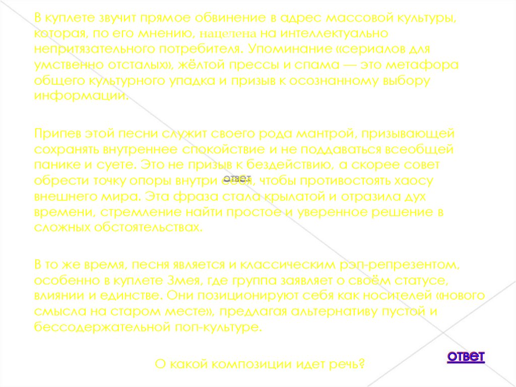 В куплете звучит прямое обвинение в адрес массовой культуры,которая, по его мнению, нацелена на интеллектуально