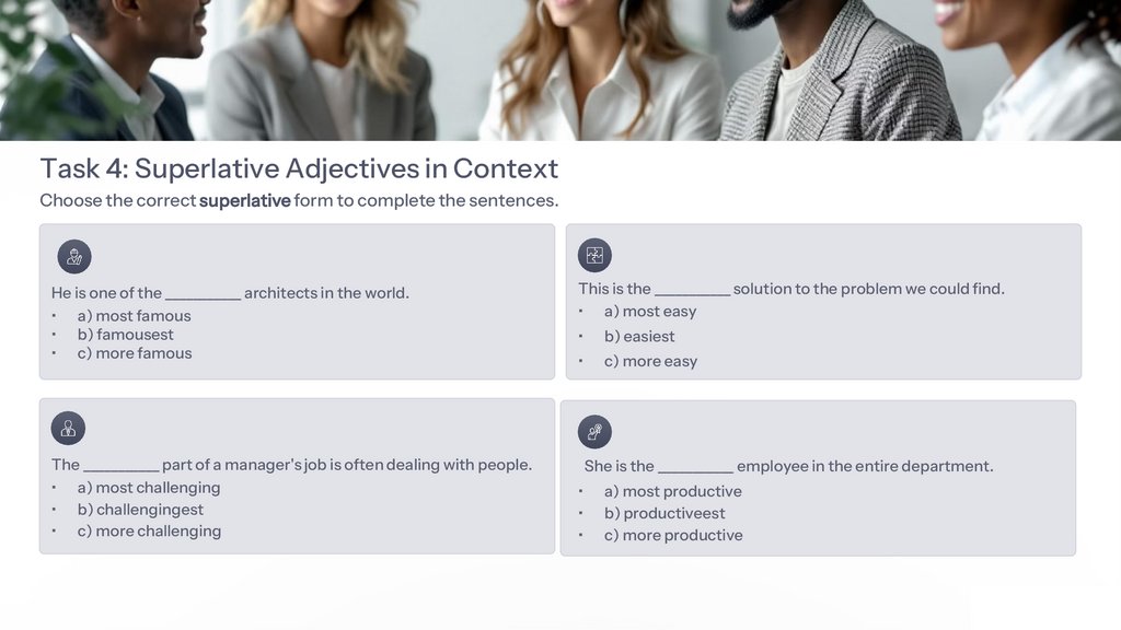 Task 4: Superlative Adjectives in ContextChoose the correct superlative form to complete the sentences.