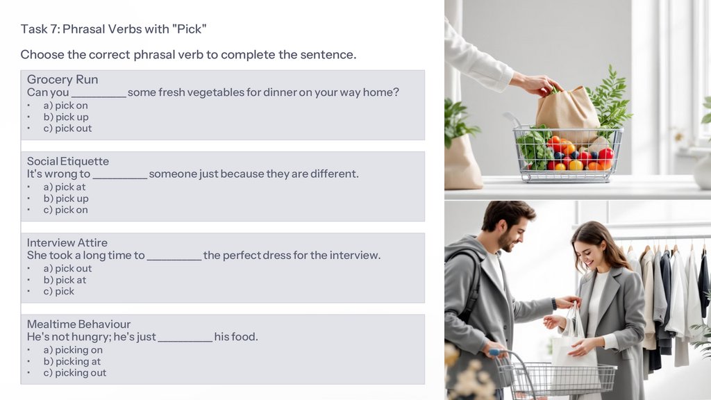 Task 7: Phrasal Verbs with "Pick"Choose the correct phrasal verb to complete the sentence.