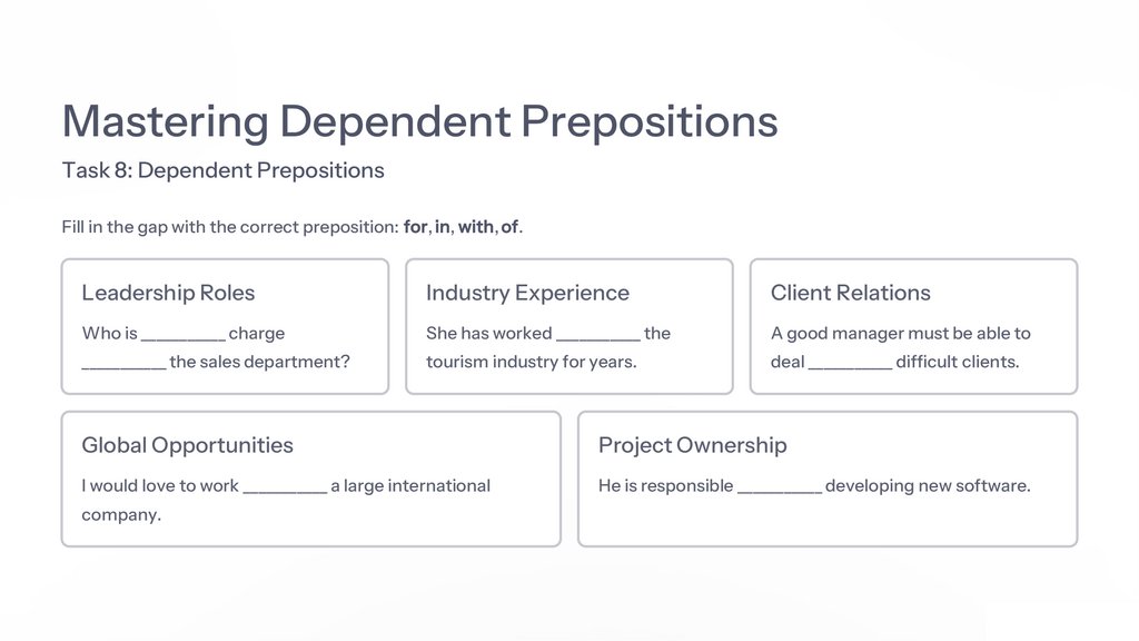 Mastering Dependent PrepositionsTask 8: Dependent Prepositions