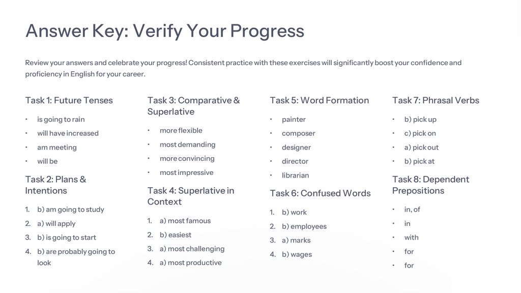 Answer Key: Verify Your ProgressReview your answers and celebrate your progress! Consistent practice with these exercises will significantly boost your confidence and