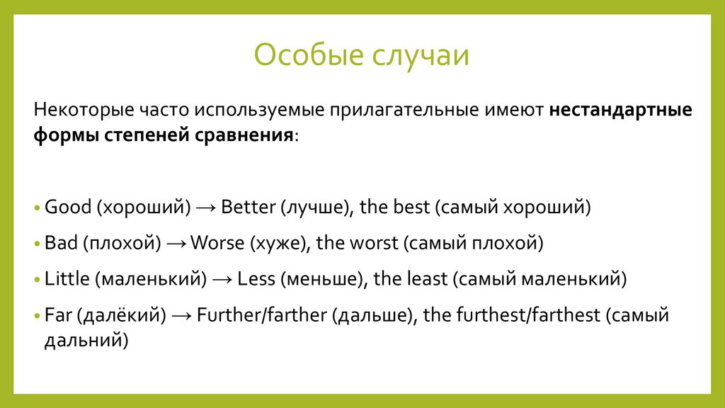 • Bad (плохой) → Worse (хуже), the worst (самый плохой)