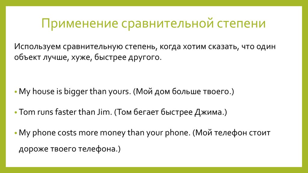 Применение сравнительной степениИспользуем сравнительную степень, когда хотим сказать, что один