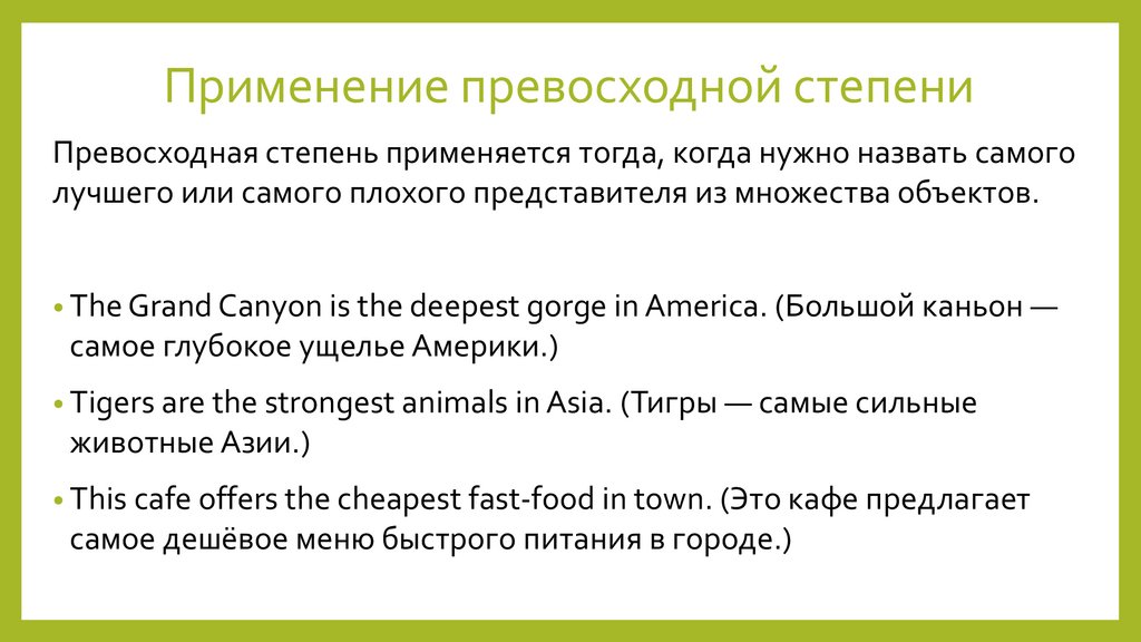 Применение превосходной степениПревосходная степень применяется тогда, когда нужно назвать самого