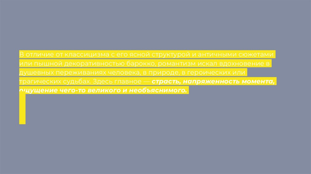 В отличие от классицизма с его ясной структурой и античными сюжетамиили пышной декоративностью барокко, романтизм искал вдохновение в