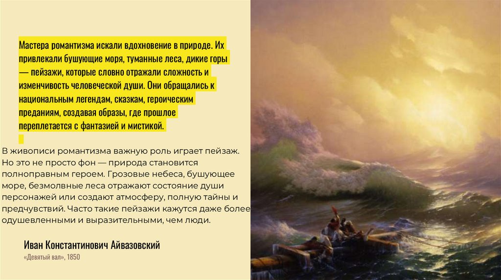 Мастера романтизма искали вдохновение в природе. Ихпривлекали бушующие моря, туманные леса, дикие горы