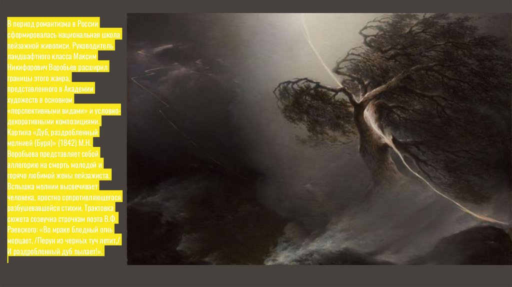 В картинах пейзажистов-романтиков часто встречается эффектное сочетаниеразличных источников освещения: холодного сияния луны и жарких отсветов