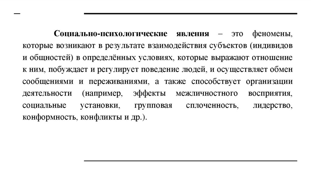 Социально-психологические явления – это феномены,которые возникают в результате взаимодействия субъектов (индивидов