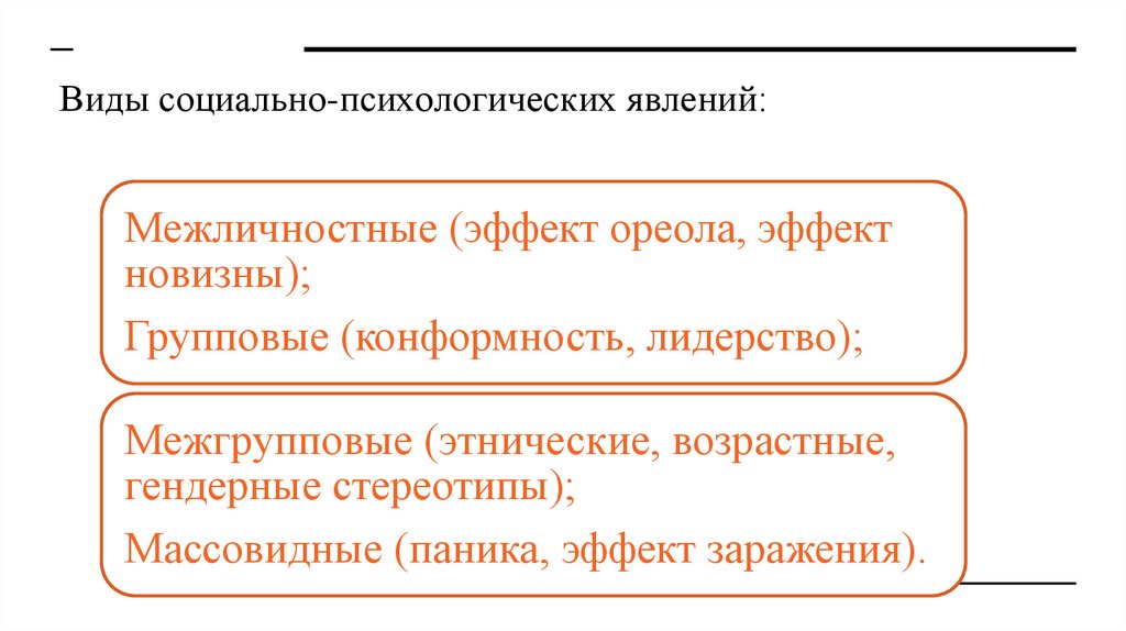 Виды социально-психологических явлений:Межличностные (эффект ореола, эффект