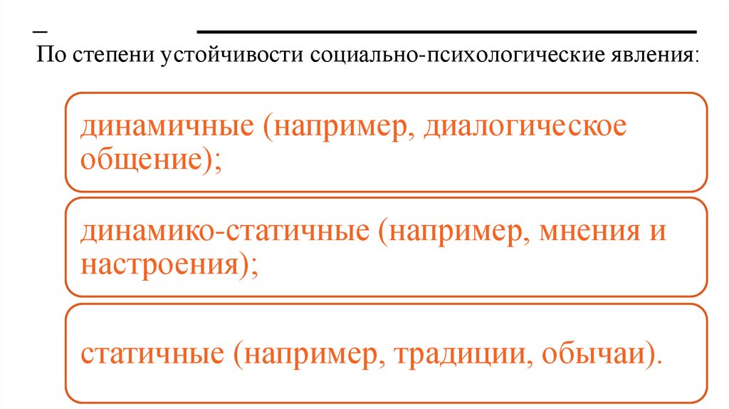 По степени устойчивости социально-психологические явления:динамичные (например, диалогическое