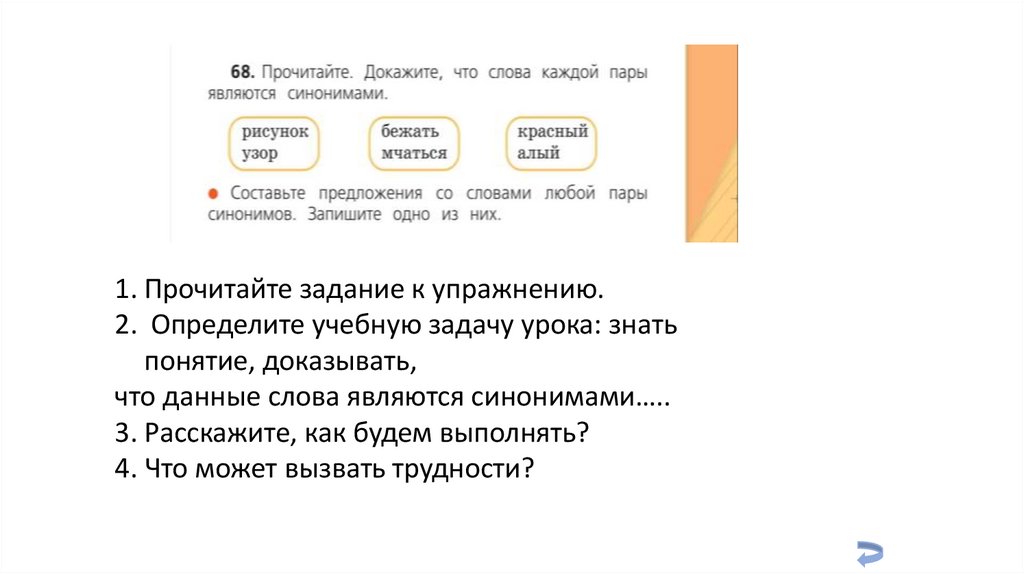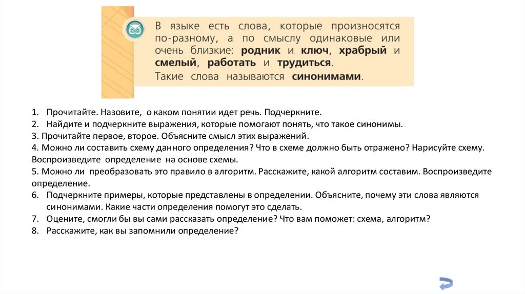 1. Прочитайте. Назовите, о каком понятии идет речь. Подчеркните.2. Найдите и подчеркните выражения, которые помогают понять, что такое синонимы.