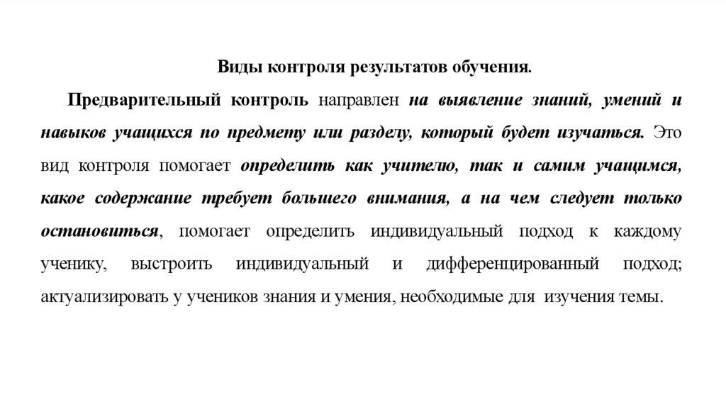 Виды контроля результатов обучения.Предварительный контроль направлен на выявление знаний, умений и