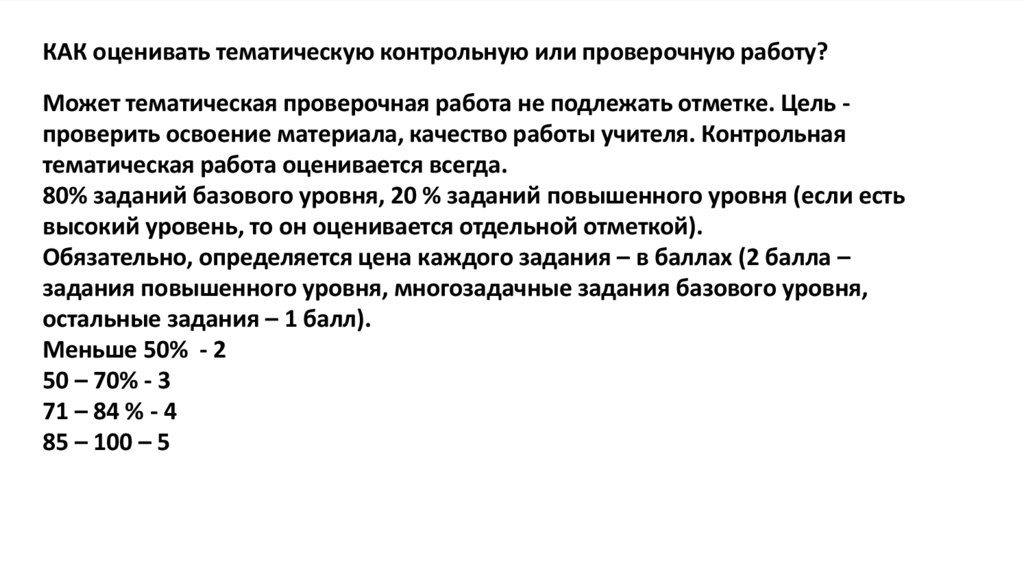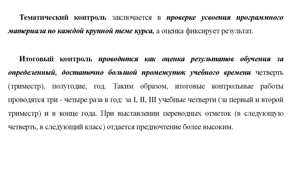 Тематический контроль заключается в проверке усвоения программногоматериала по каждой крупной теме курса, а оценка фиксирует результат.