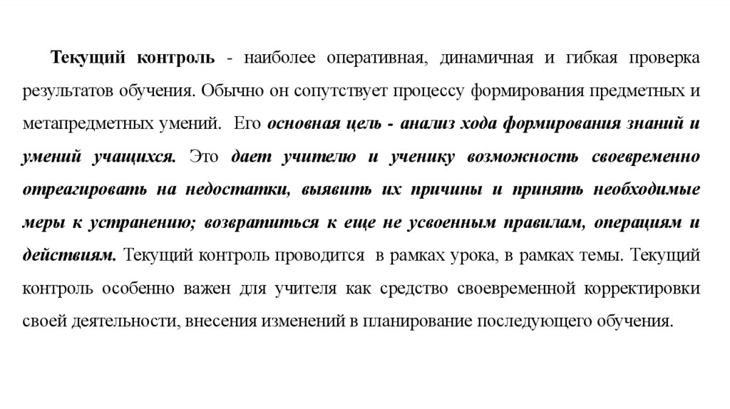 Текущий контроль - наиболее оперативная, динамичная и гибкая проверкарезультатов обучения. Обычно он сопутствует процессу формирования предметных и