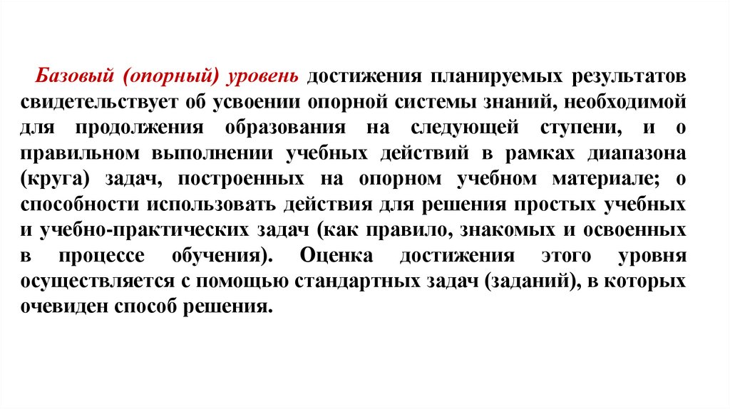 Базовый (опорный) уровень достижения планируемых результатовсвидетельствует об усвоении опорной системы знаний, необходимой