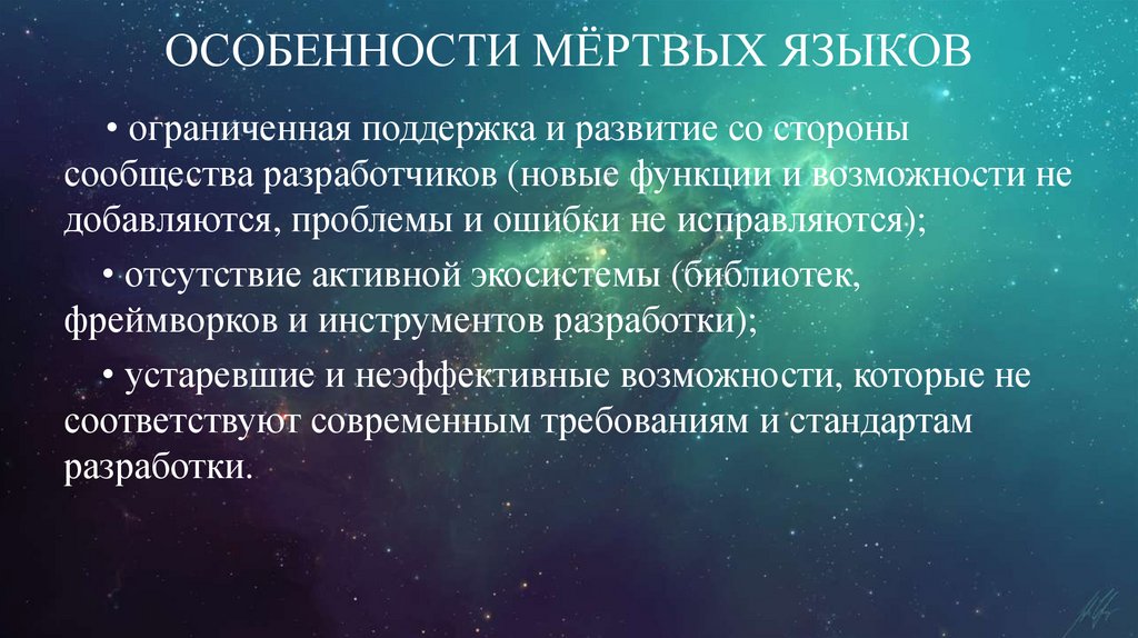 ОСОБЕННОСТИ МЁРТВЫХ ЯЗЫКОВ• ограниченная поддержка и развитие со стороны