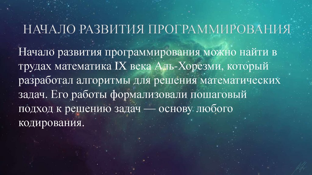Начало развития программирования можно найти втрудах математика IX века Аль-Хорезми, который