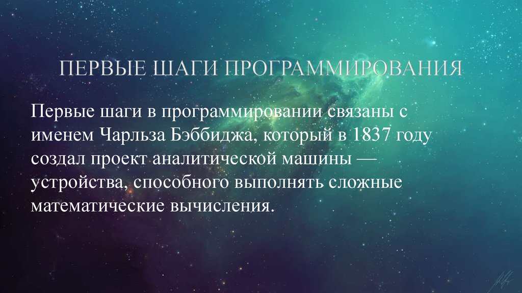 Первые шаги в программировании связаны сименем Чарльза Бэббиджа, который в 1837 году