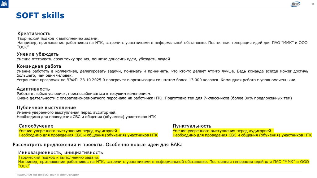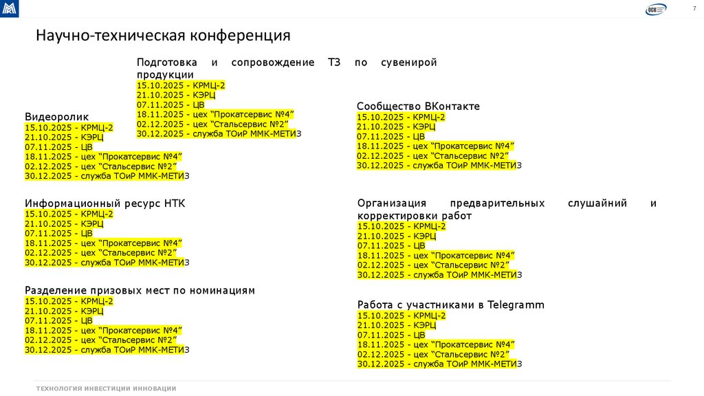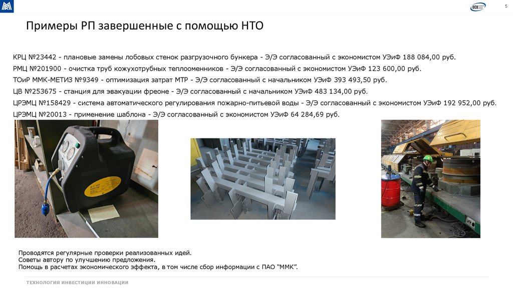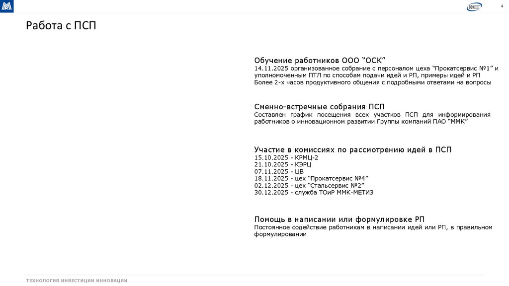 Например, приглашение работников на НТК, встречи с участниками в неформальной обстановке. Постоянная генерация идей для ПАО “ММК” и ООО