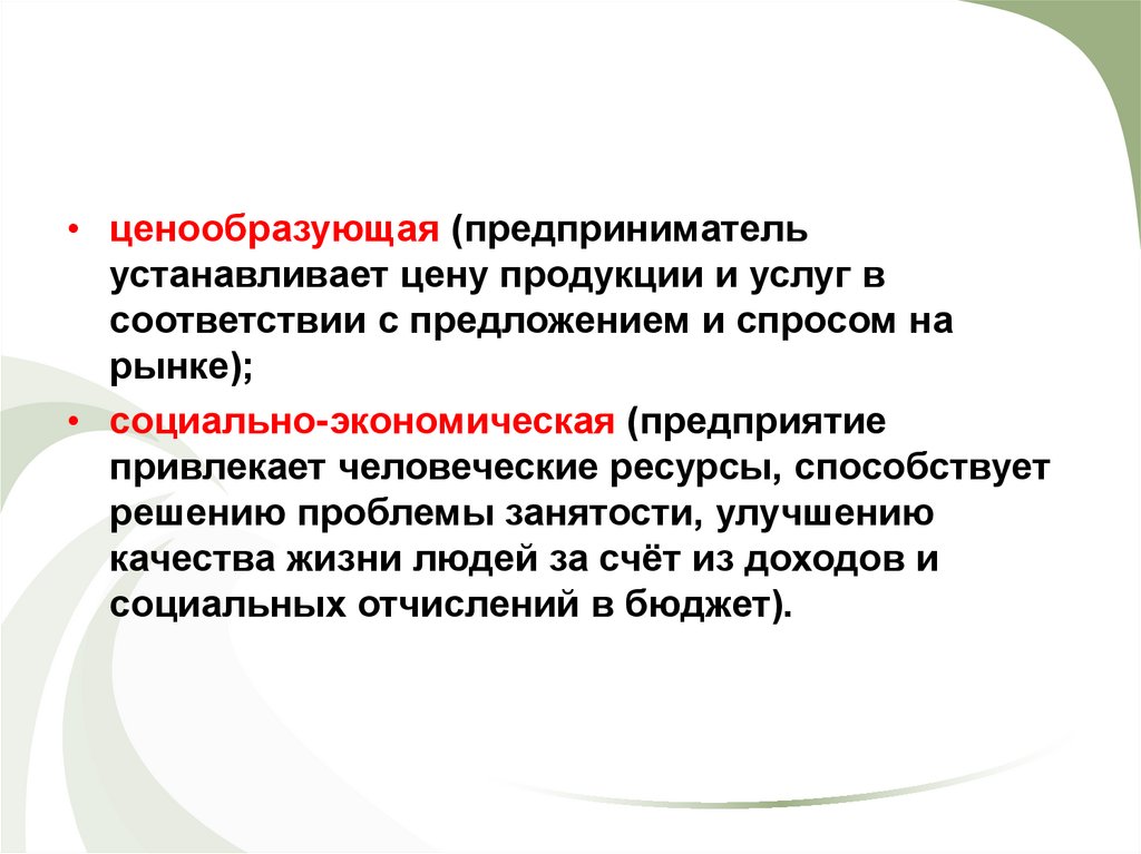 • ценообразующая (предпринимательустанавливает цену продукции и услуг в