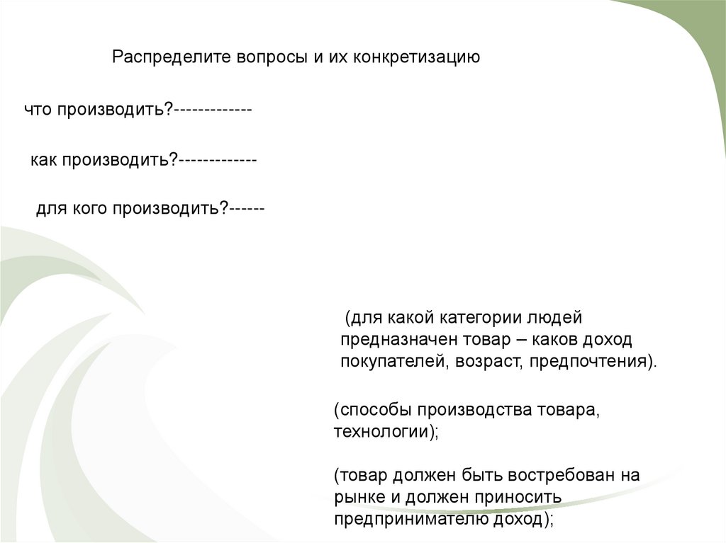 Распределите вопросы и их конкретизациючто производить?------------как производить?------------для кого производить?------