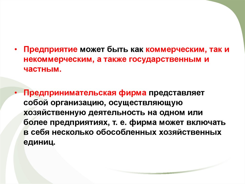 • Предприятие может быть как коммерческим, так инекоммерческим, а также государственным и