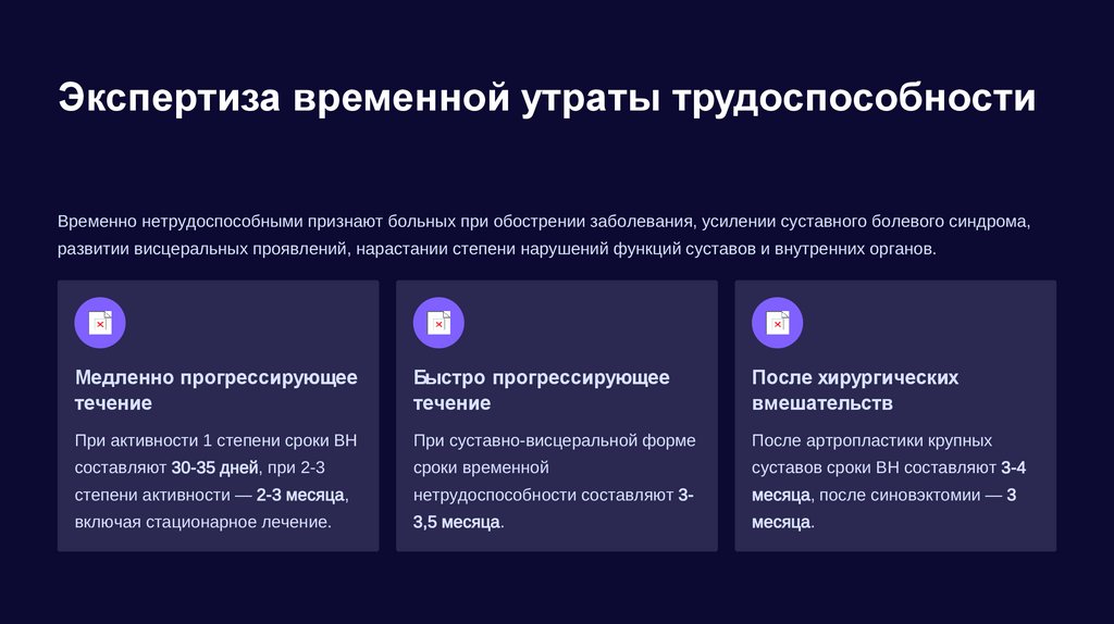 Экспертиза временной утраты трудоспособностиВременно нетрудоспособными признают больных при обострении заболевания, усилении суставного болевого синдрома,