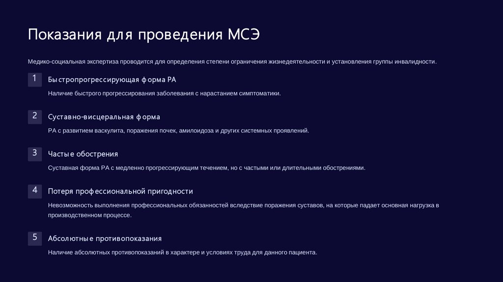 Показания дл я проведения МСЭМедико-социальная экспертиза проводится для определения степени ограничения жизнедеятельности и установления группы инвалидности.