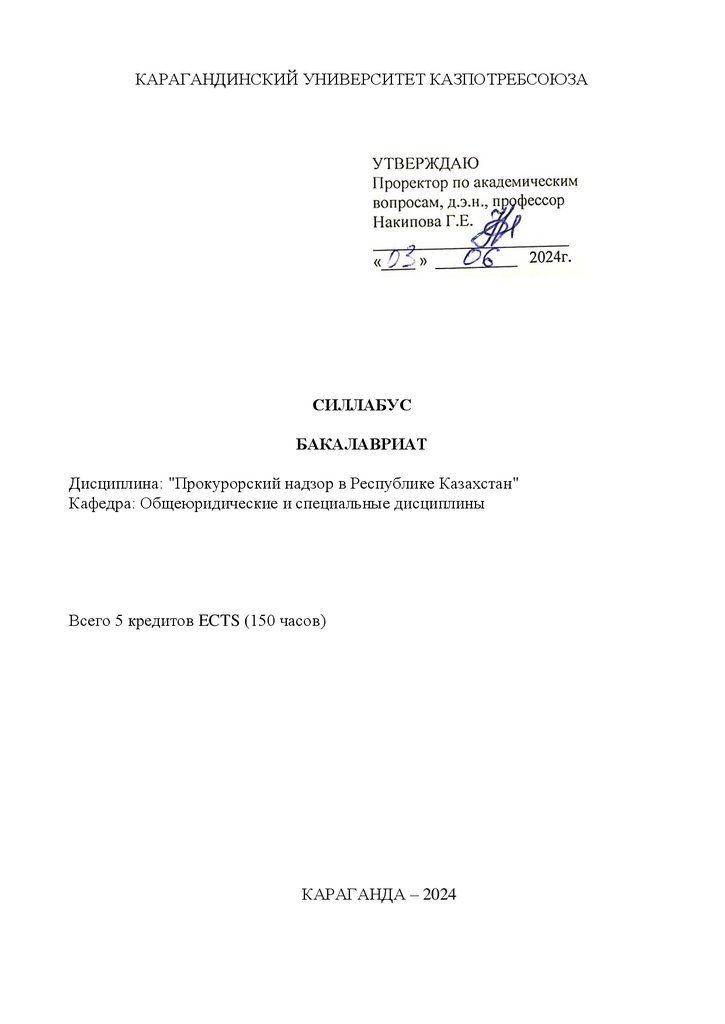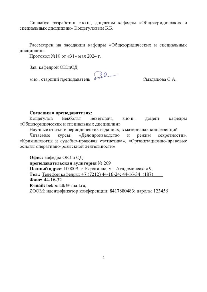 Силлабус разработан к.ю.н., доцентом кафедры «Общеюридических испециальных дисциплин» Кощегуловым Б.Б.