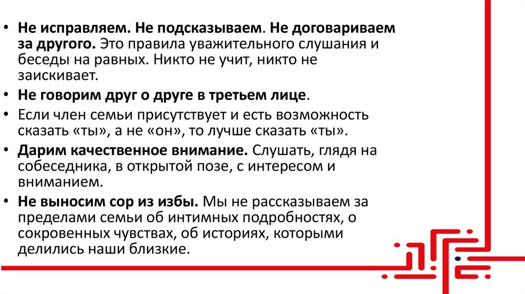 • Не исправляем. Не подсказываем. Не договариваемза другого. Это правила уважительного слушания и