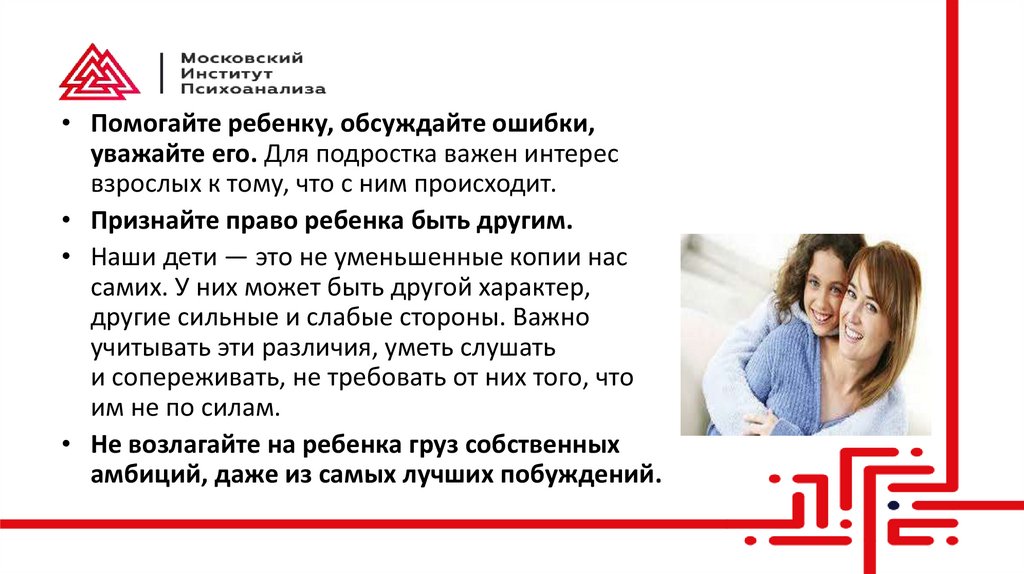 • Безусловно принимать ребенка – значит любить его не за то, что онкрасивый, умный, способный, отличник, помощник и так далее, а