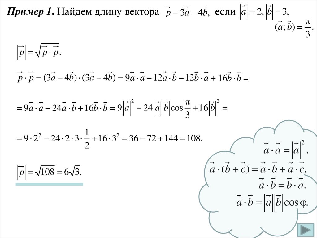 Пример 1. Найдем длину вектора p 3a 4b, если a 2, b 3,(a; b) .