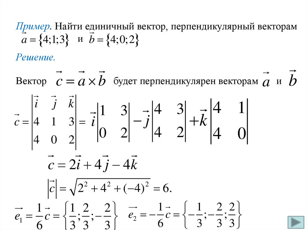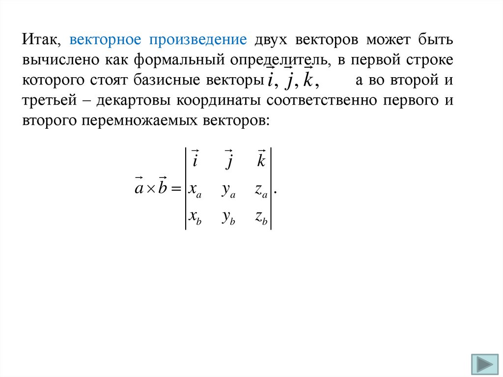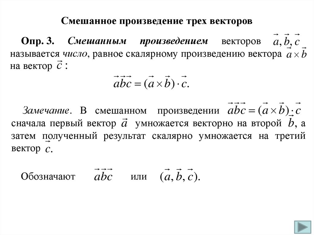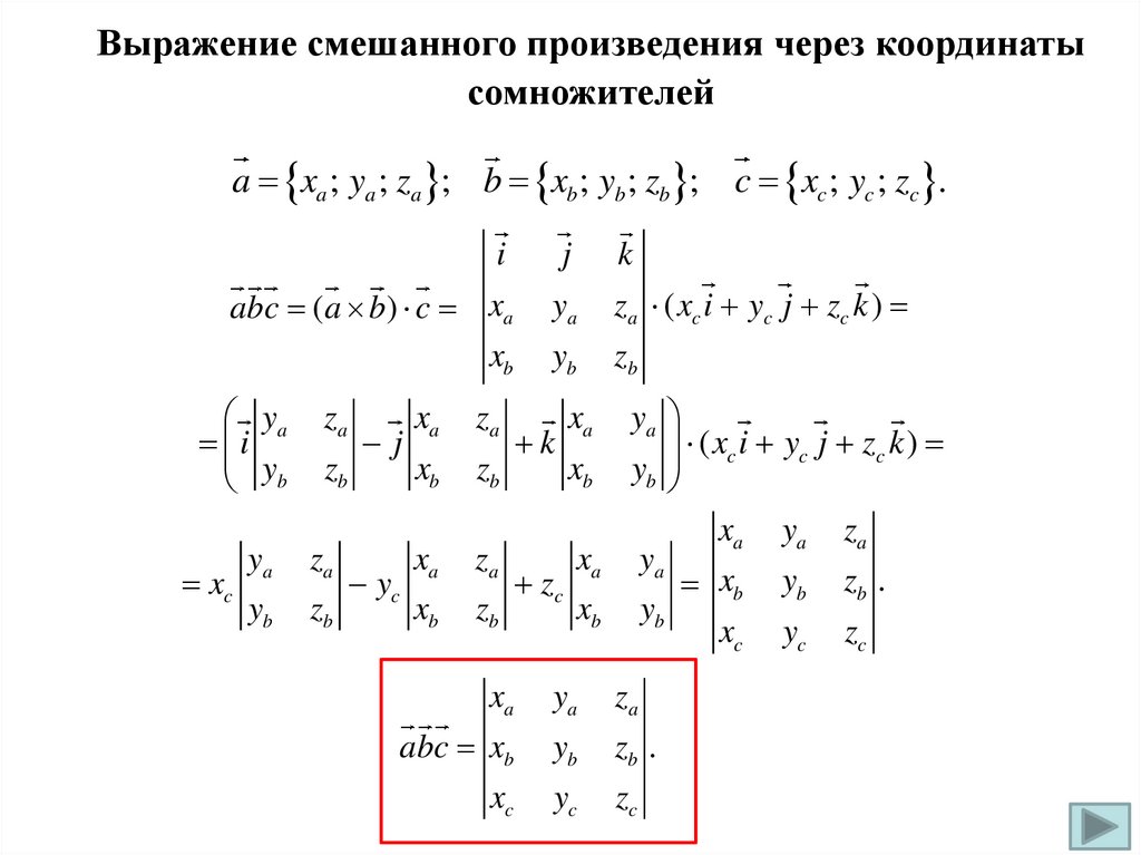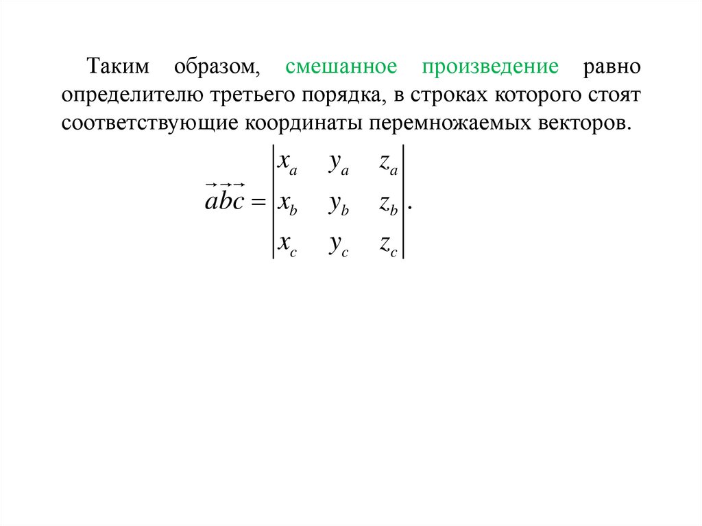 Таким образом, смешанное произведение равноопределителю третьего порядка, в строках которого стоят