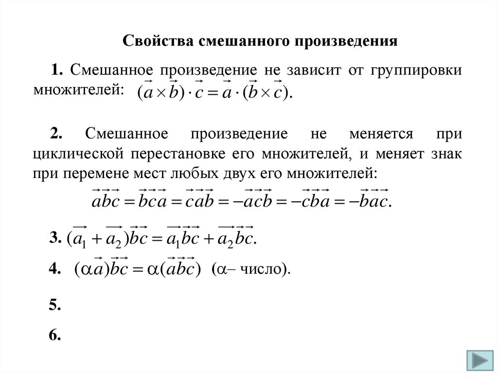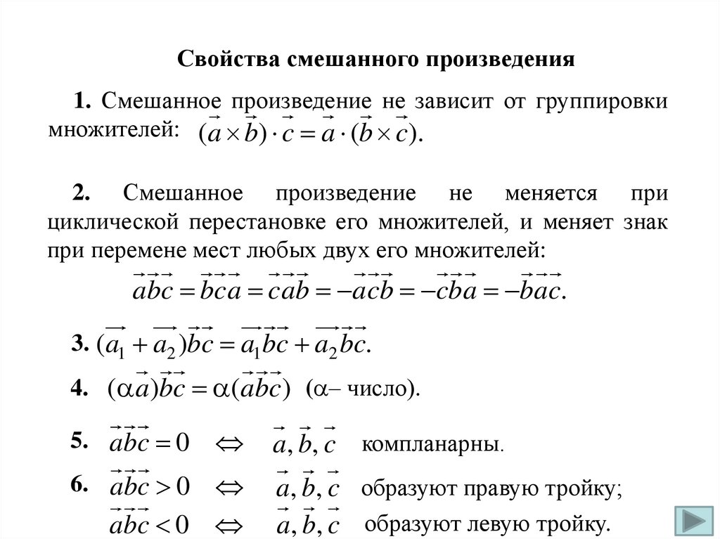 Свойства смешанного произведения1. Смешанное произведение не зависит от группировки