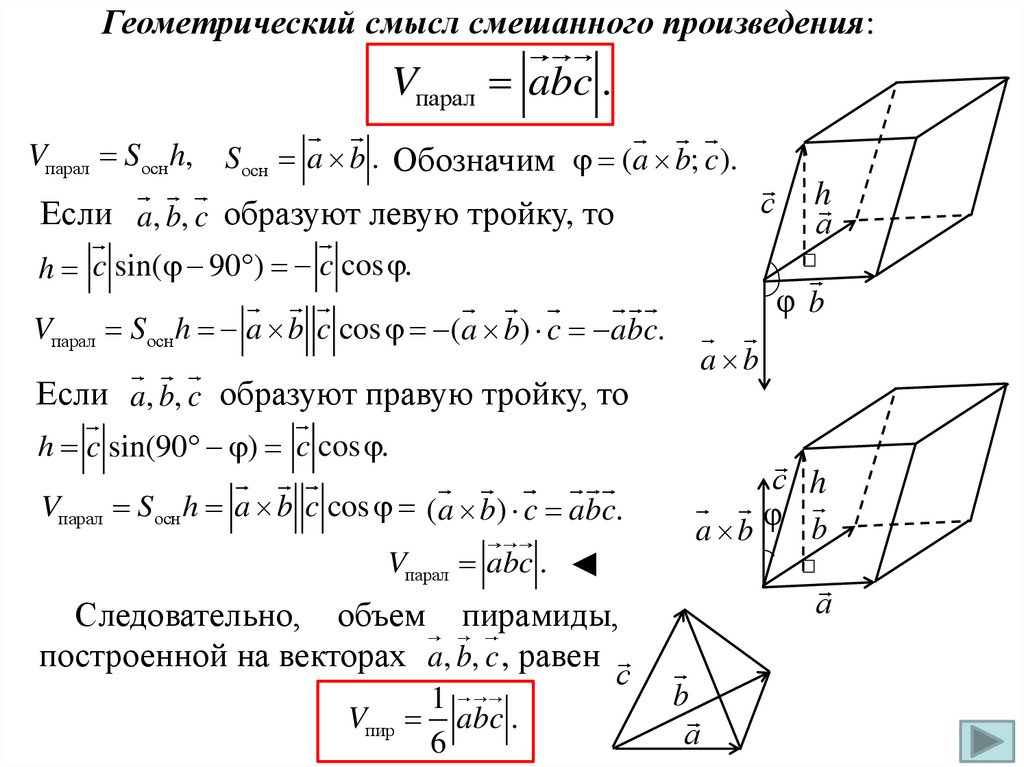 Геометрический смысл смешанного произведения:Vпарал abc .