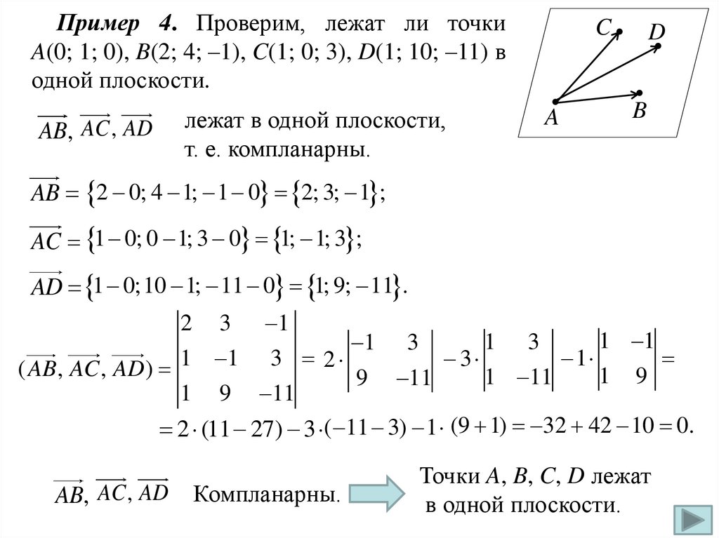 Пример 4. Проверим, лежат ли точкиA(0; 1; 0), B(2; 4; –1), C(1; 0; 3), D(1; 10; –11) в