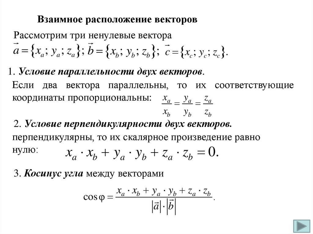 Взаимное расположение векторовРассмотрим три ненулевые вектора