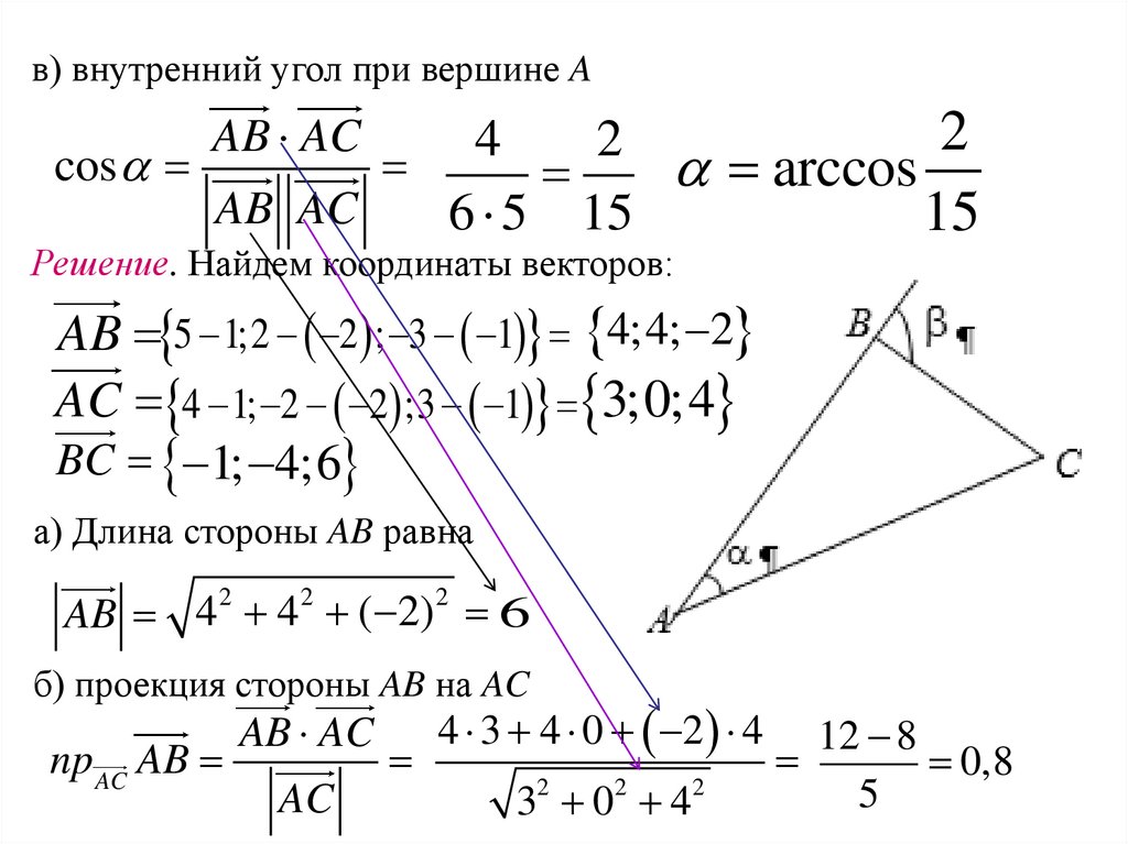 Найти: а) длину стороны AB; б) проекцию стороны AB на AC; в)