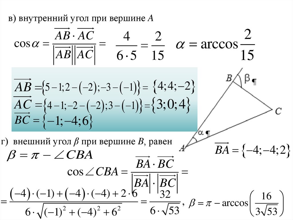 внутренний угол при вершине A; г) внешний угол при вершине B.