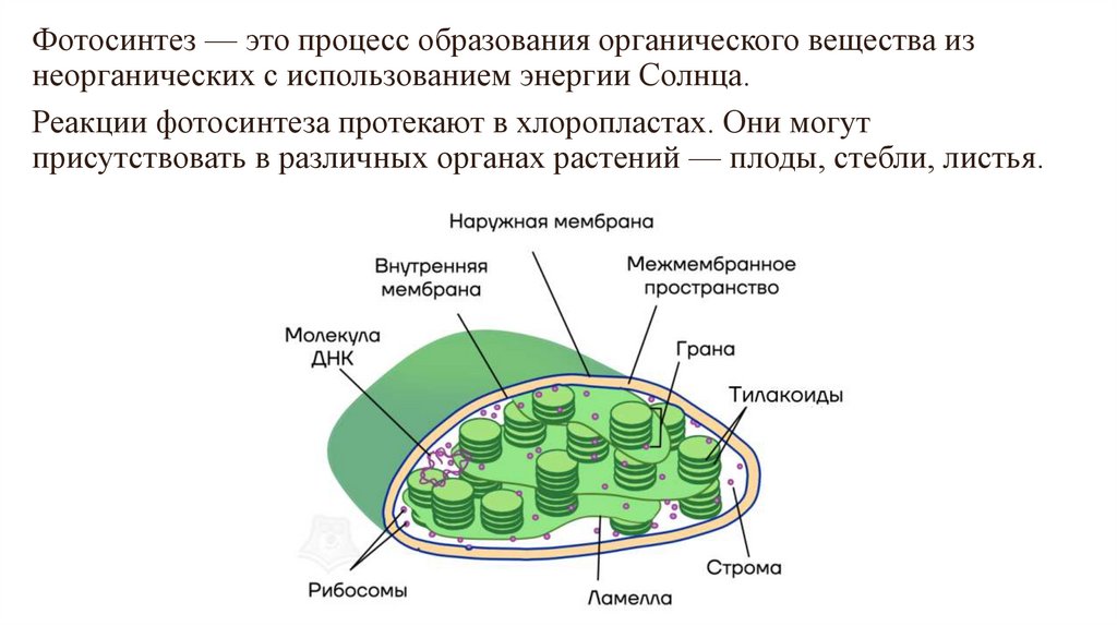 Фотосинтез — это процесс образования органического вещества изнеорганических с использованием энергии Солнца.