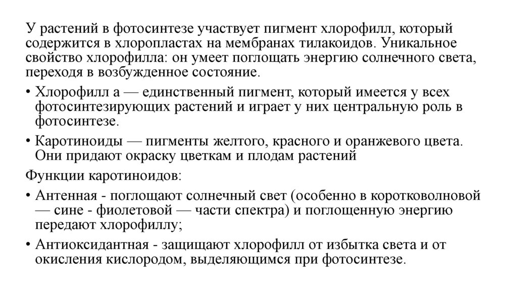 • Хлорофилл а — единственный пигмент, который имеется у всех