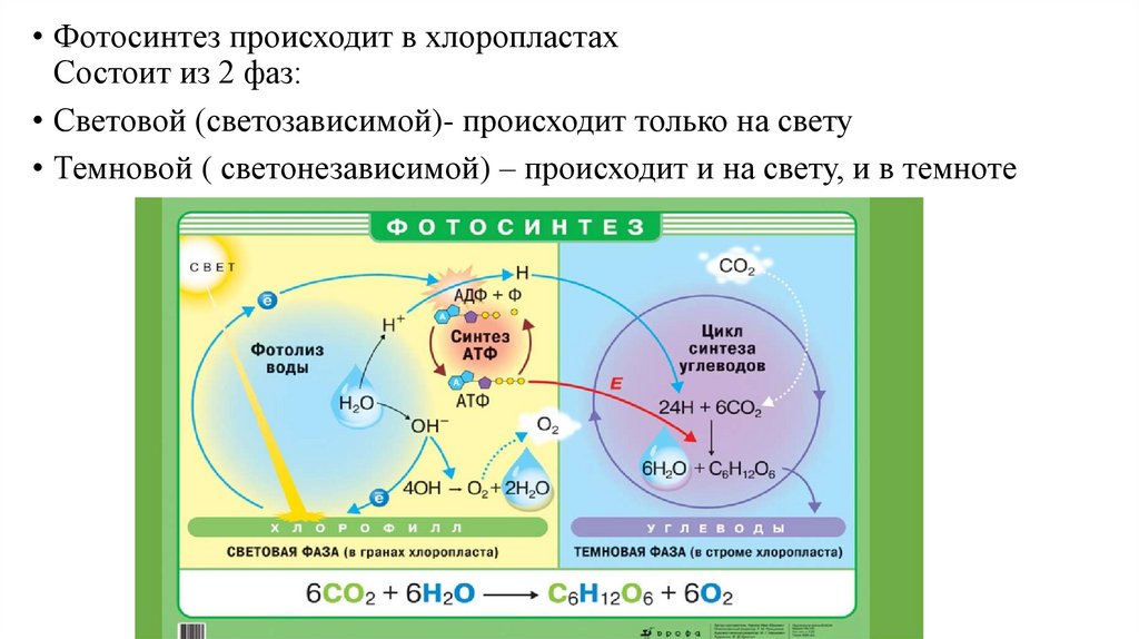 • Фотосинтез происходит в хлоропластахСостоит из 2 фаз: