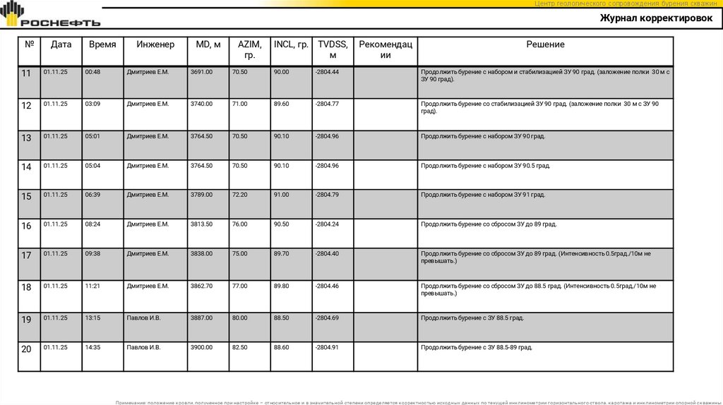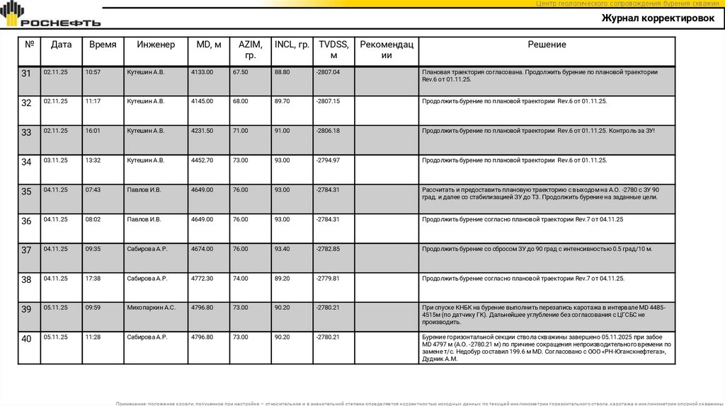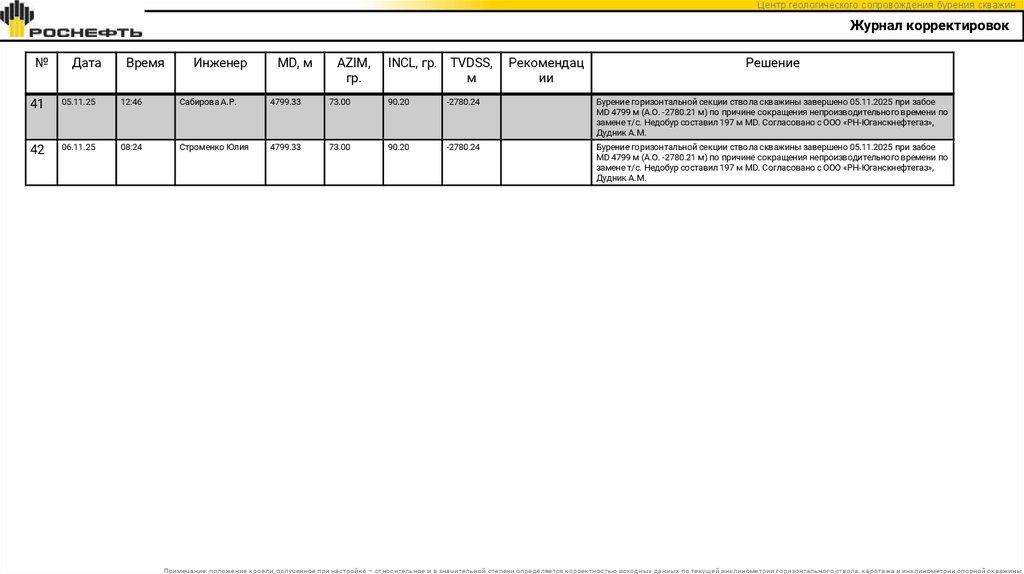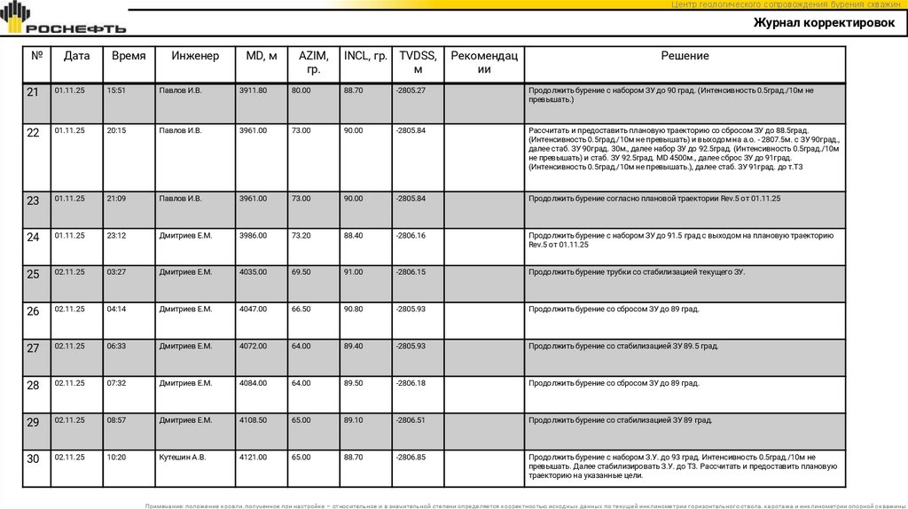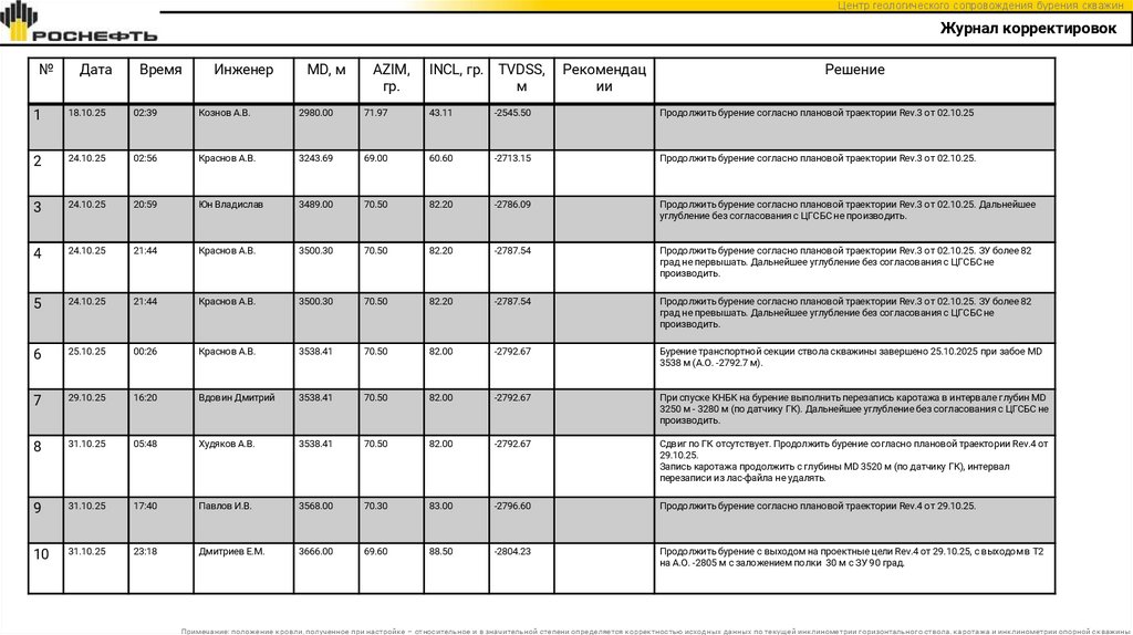 Центр геологического сопровождения бурения скважинЖурнал корректировок