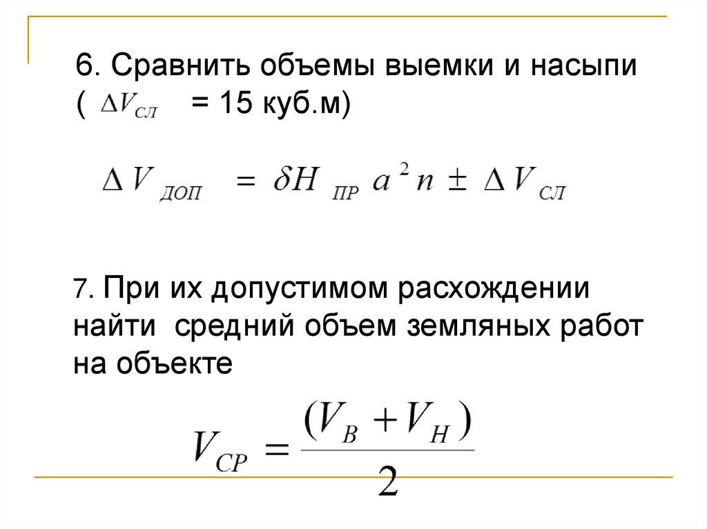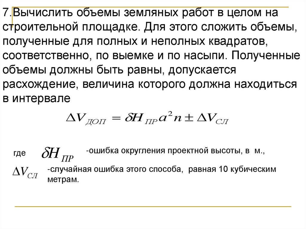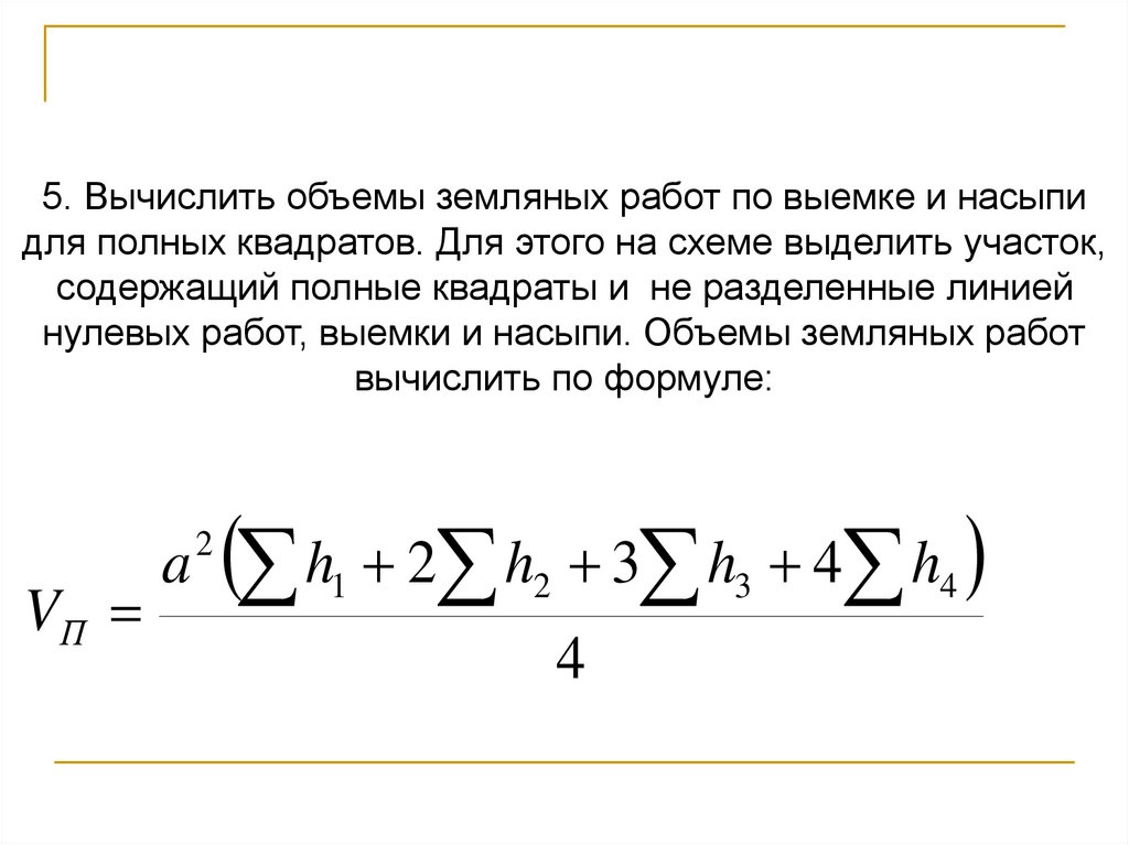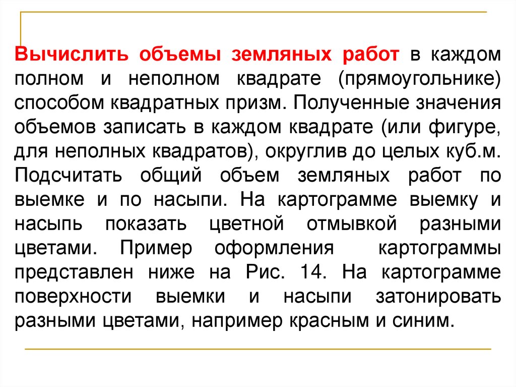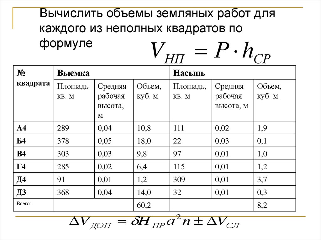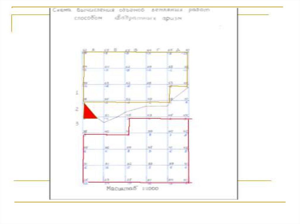 Вычислить объемы земляных работ в каждомполном и неполном квадрате (прямоугольнике)