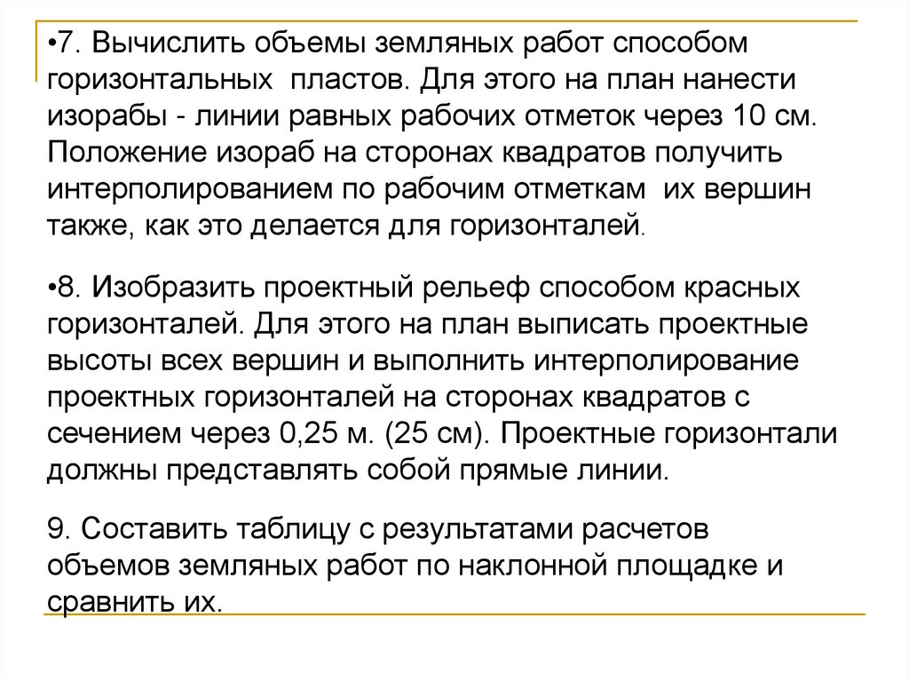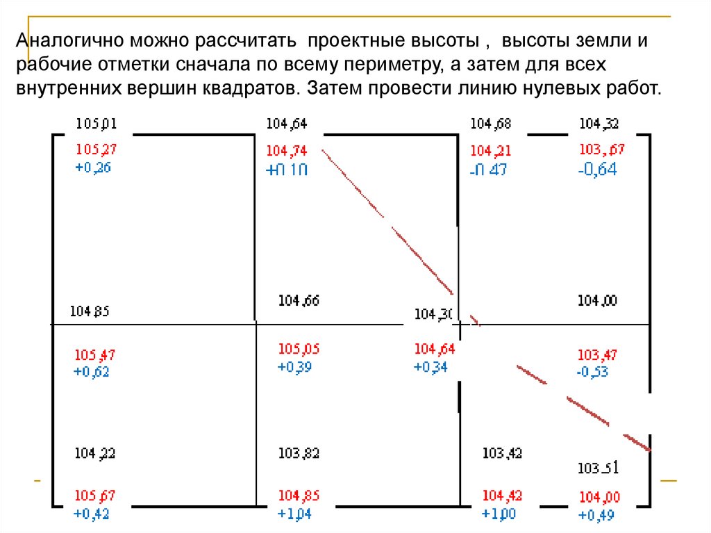 Аналогично можно рассчитать проектные высоты , высоты земли ирабочие отметки сначала по всему периметру, а затем для всех