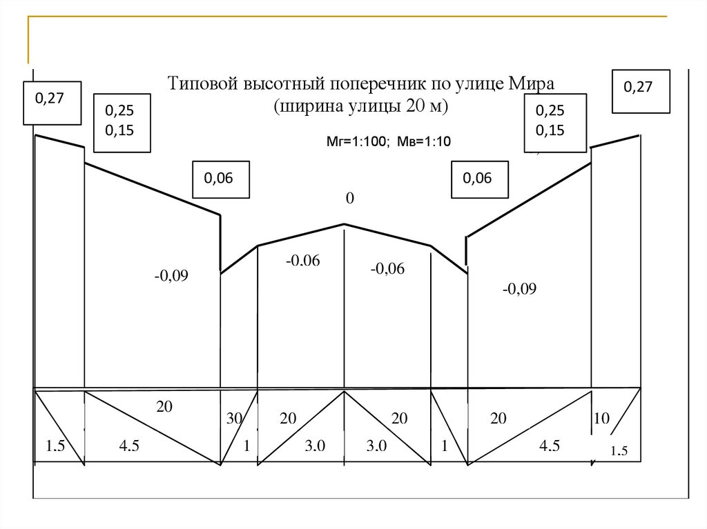 Высота сечения проектного рельефа 0,25 м. Например, от угла квартала 1 по улице Мира