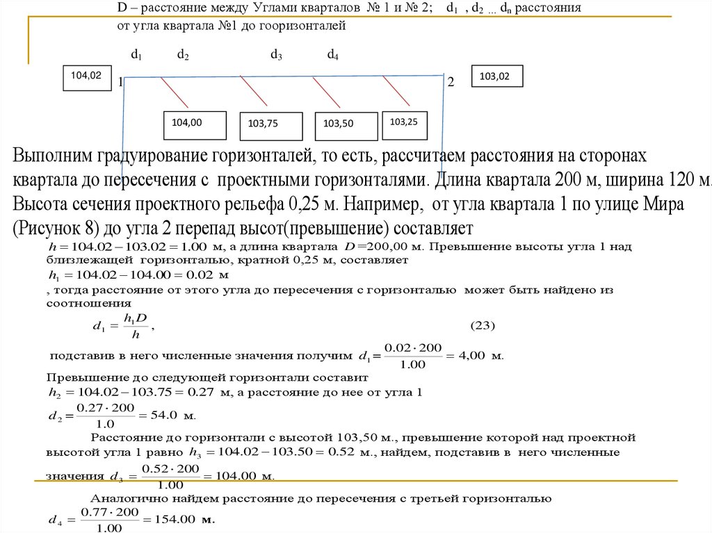 h 104.02 103.02 1.00 м, а длина квартала D =200,00 м. Превышение высоты угла 1 над